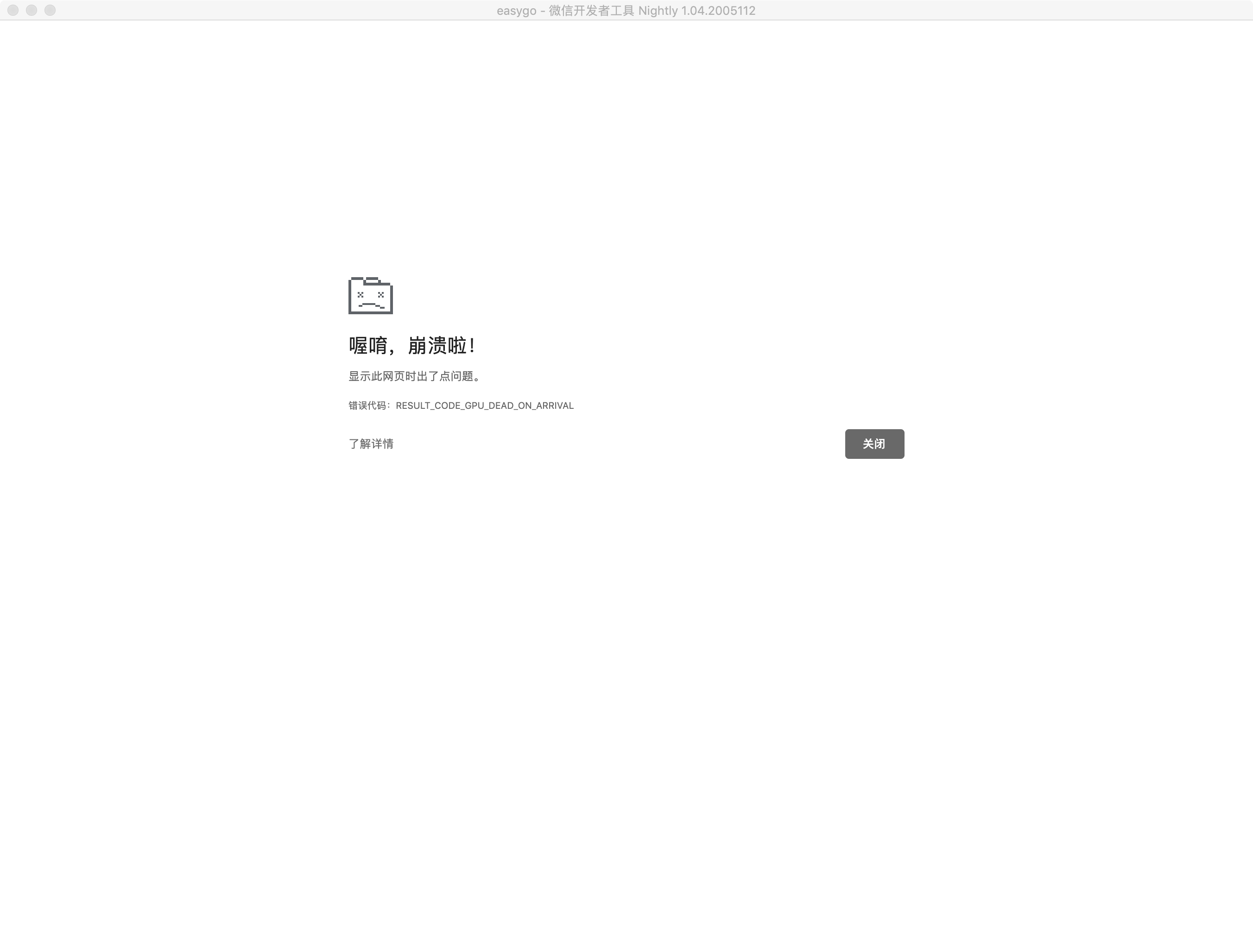 操作系统版本:MacOS Mojave 10.14.6,微信开者工具版本:1.04.2005112。我在使用过程中经常出现崩溃现象。