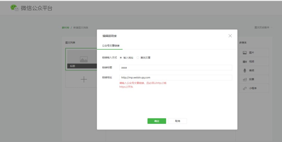 微信公众号,素材管理,新建图文素材,超链接