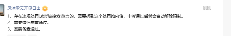 1、存在违规处罚封禁‘被搜索’能力的,需要找到这个处罚站内信,申诉通过后就会自动解除限制。