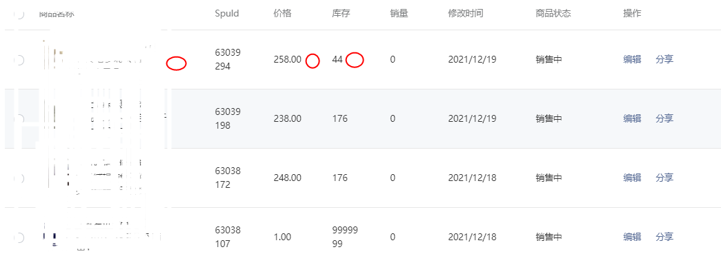 在红圈处添加功能按钮,修改标题,修改价格,修改库存,含多个SKU的弹出页面,可单独修改各个SKU的价格和库存或者编码