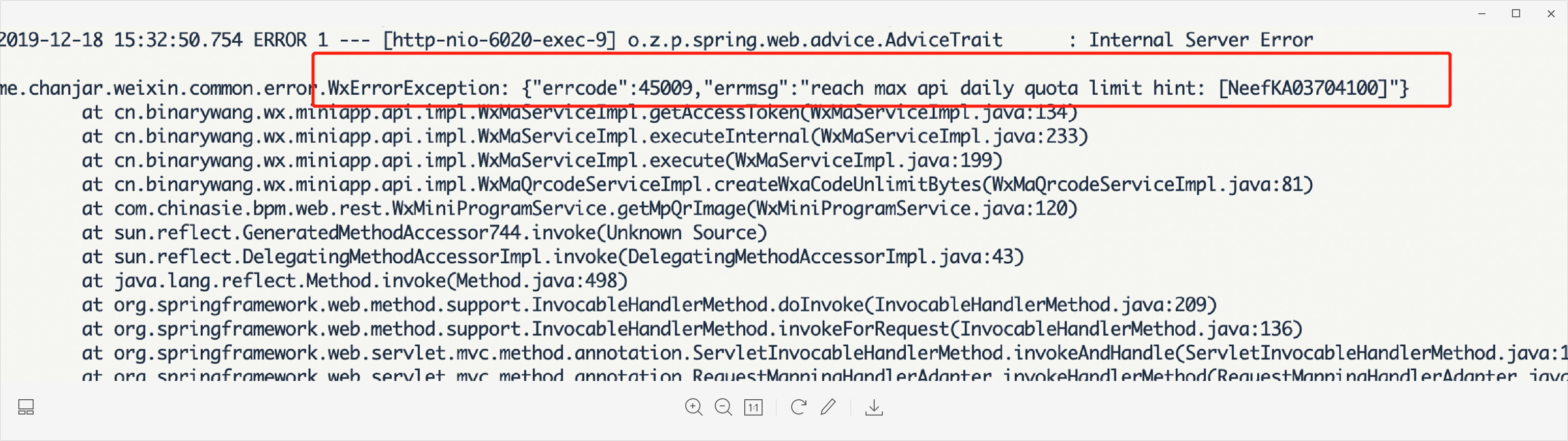 你好,如截图所示,我们在调用小程序码是报错45009,就是所以报错超过每分钟5000次调用的限制,所以我们特意加了调用日志,今天我们从0:00分开始到下午3点多,就开始报错了,但是日次查看后只有1360次。所以我想咨询下这个问题是怎么造成的呢?感谢。