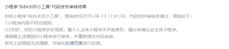 你好,经核实,贵方小程序涉及视频,属个人主体小程序未开放类目,建议申请企业主体小程序。若其他小程序存在违规信息的,建议你线上提交投诉,且上传投诉证据