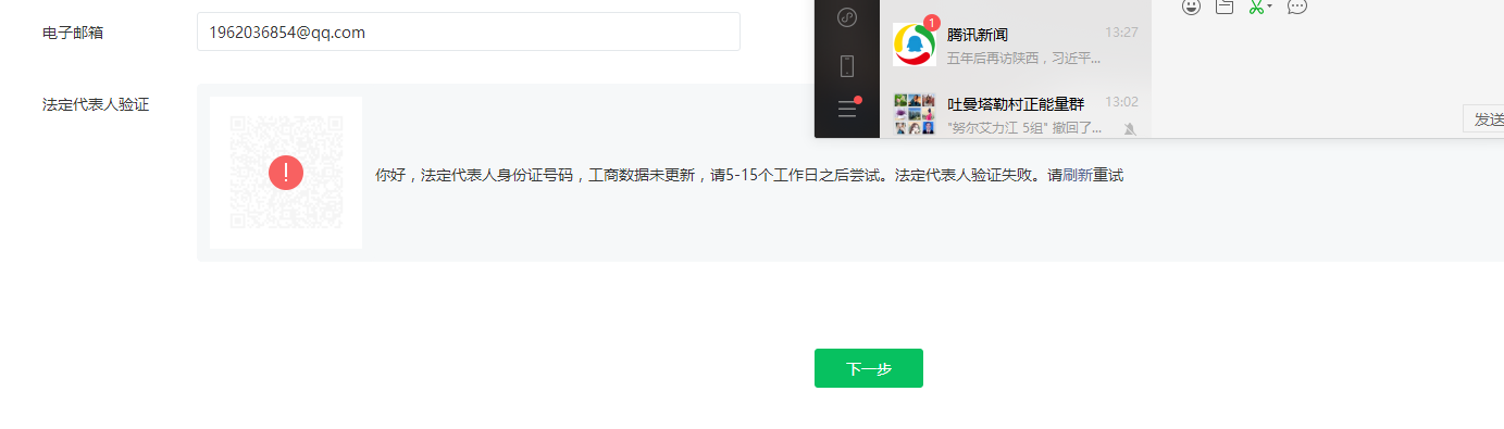 申请微信公众号微信认证时,出现法定代表人身份证号码,工商数据未更新的情况,我是个体工商户,怎么解决? 我也遇到同样的问题,求帮忙