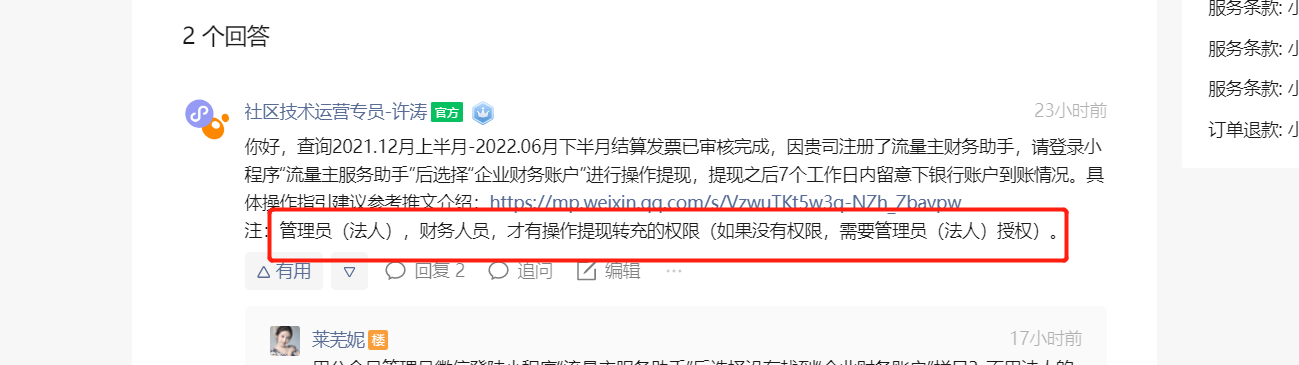 你好,查询2021.12月上半月-2022.06月下半月结算发票已审核完成,因贵司注册了流量主财务助手,请登录小程序“流量主服务助手”后选择“企业财务账户”进行操作提现,提现之后7个工作日内留意下银行账户到账情况。具体操作指引建议参考推文介绍:https://mp.weixin.qq.com/s/VzwuTKt5w3q-NZh_Zbavpw