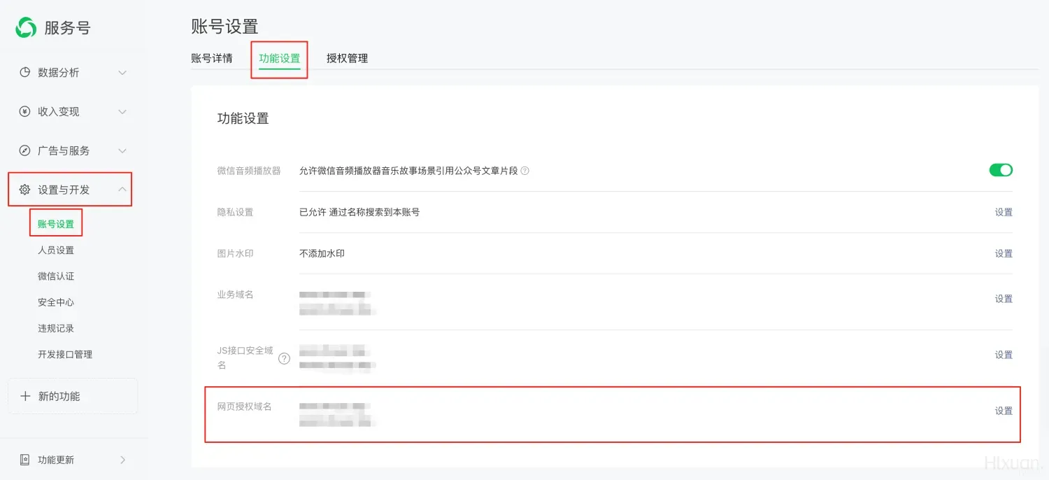 2、已完成微信认证的服务号可以在 服务号后台 https://mp.weixin.qq.com/ -> 设置与开发 -> 账号设置 -> 功能设置 里面看到「网页授权域名」的配置入口。