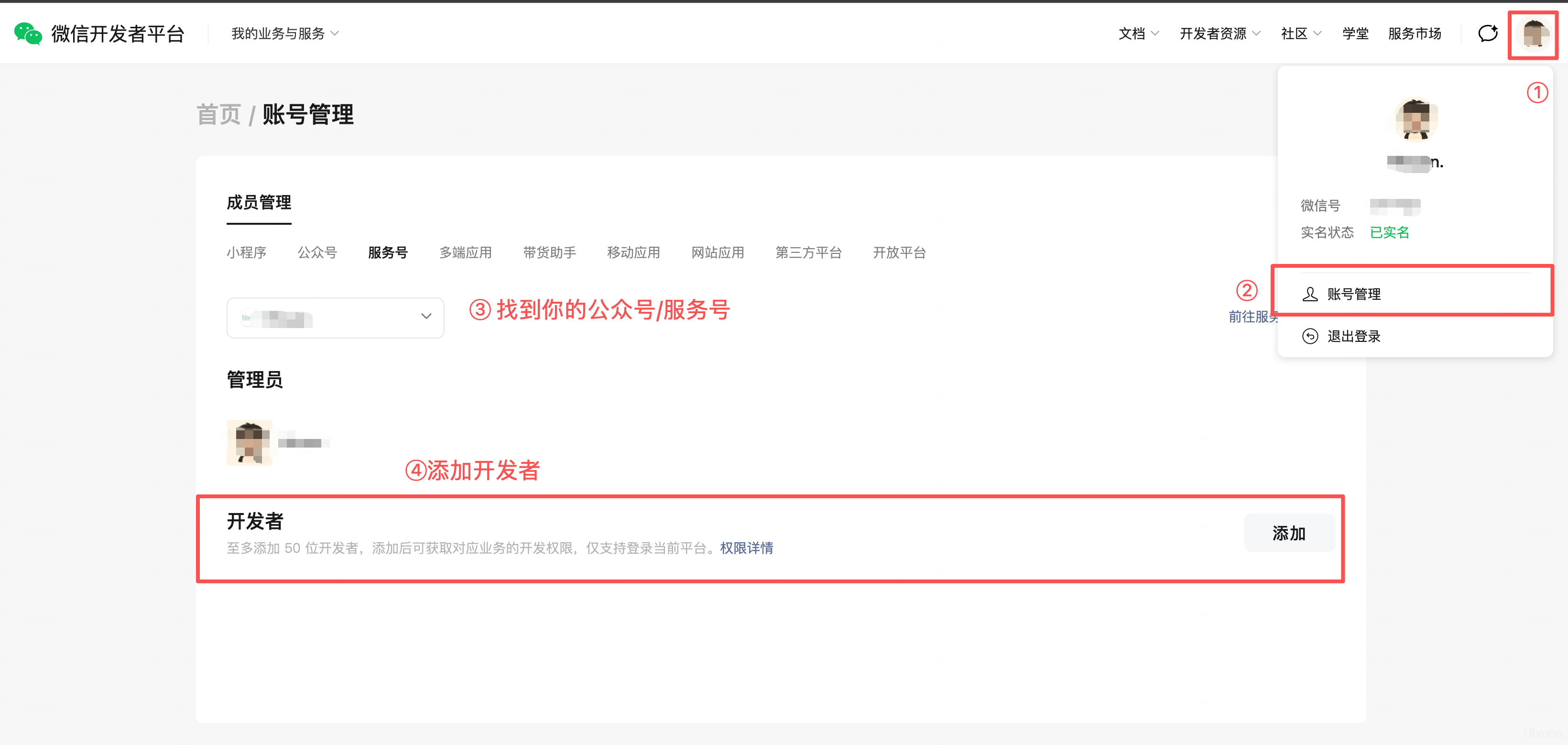 1、公众号/服务号管理员扫码登录微信开发者平台 https://developers.weixin.qq.com/platform -> 右上角头像 -> 账号管理 -> 找到你的公众号/服务号 就可以操作添加开发者了。