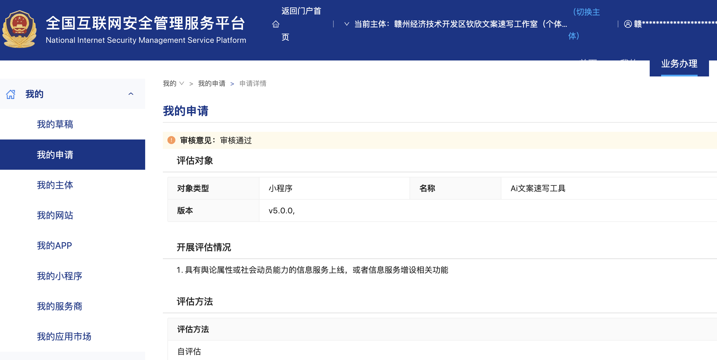 2.接入api接口为百度智能云千帆大模型平台,可提供主体签约协议。重新提交了代码并已审核通过,信息发布、转发、评论和通讯群组等服务功能中违法有害信息的防范处置本小程序已经接入腾讯开放平台的违禁词审核,机审人审相结合。模型名称为:ERNIE-Bot,算法名称:文心大模型算法-2.该模型经过「互联网信息服务算法备案系统」备案信息备案