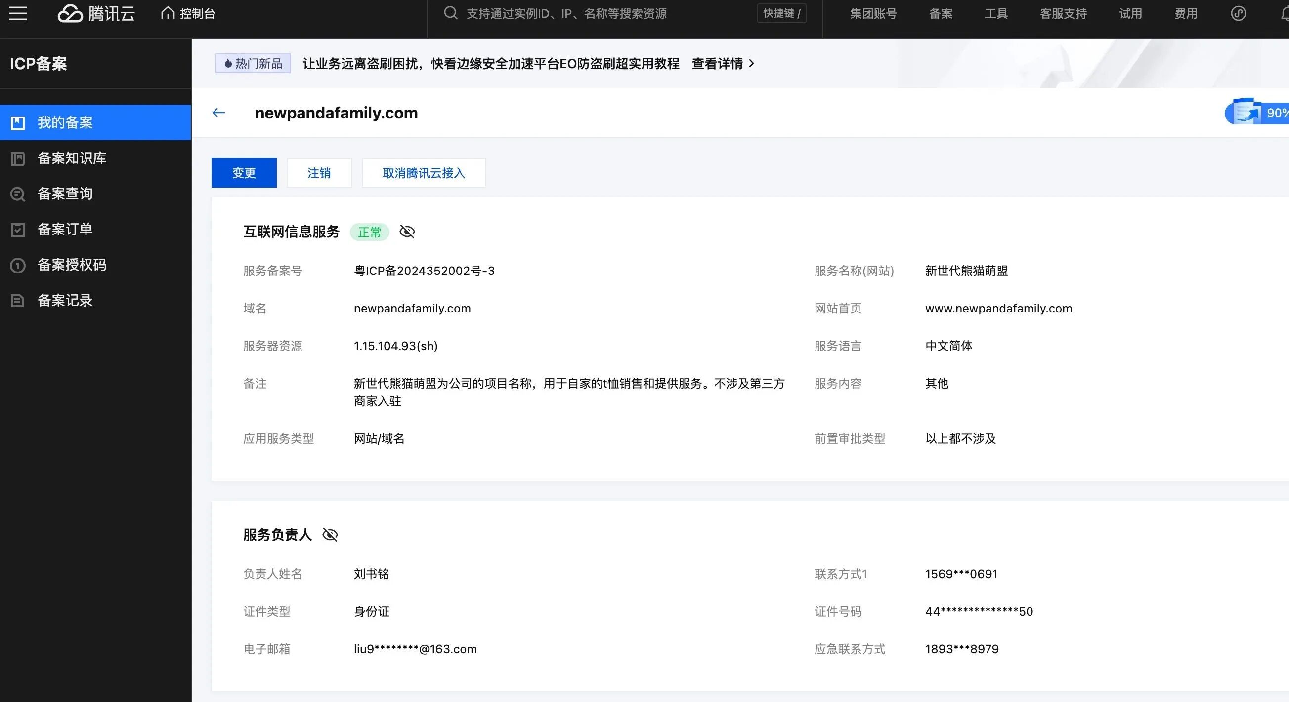 我的域名 https://newpandafamily.com 在腾讯云完成注册,服务器同样选用腾讯云服务,备案工作也已顺利办结,备案编号为粤 ICP 备 2024352002 号 - 3 。此域名关联的服务 “新世代熊猫萌盟”,核心功能是为用户提供信息浏览服务。