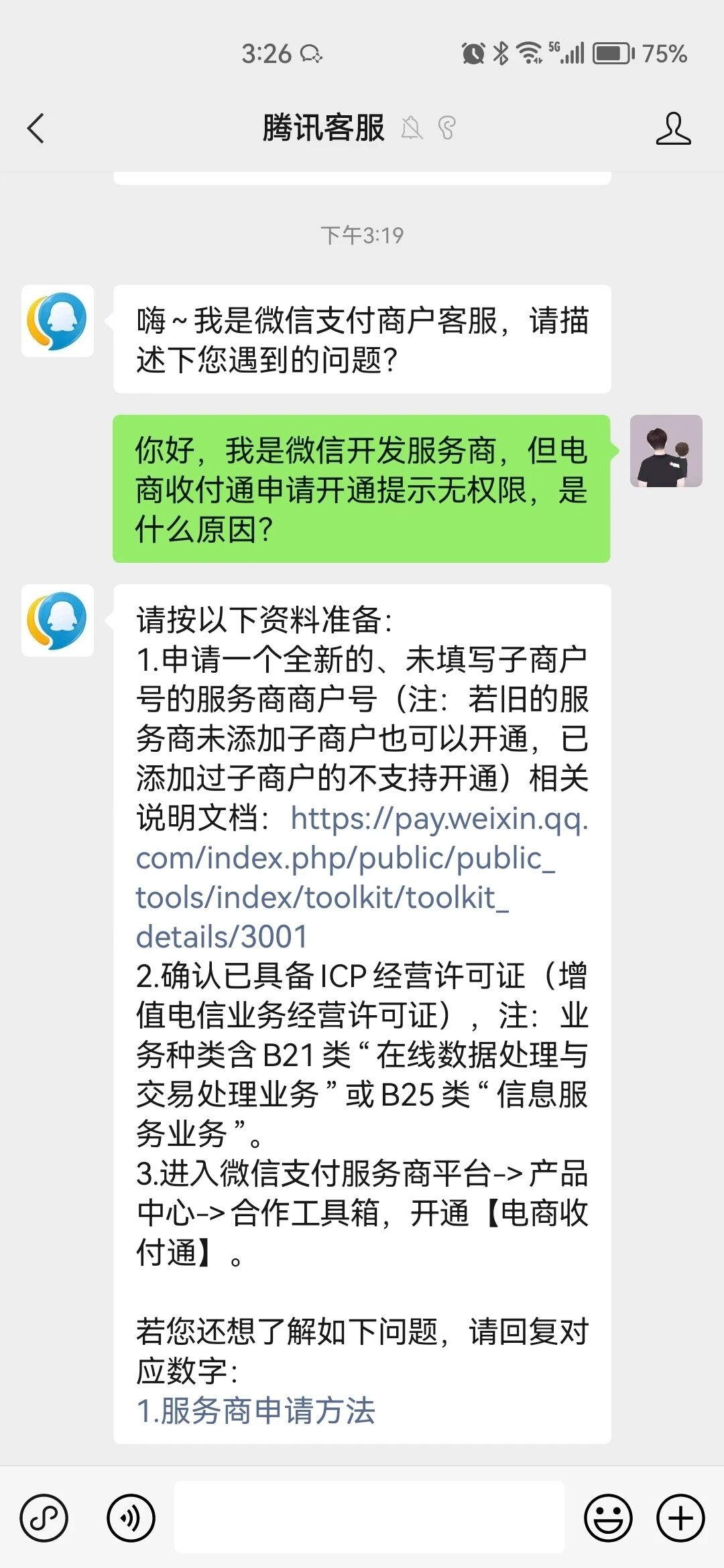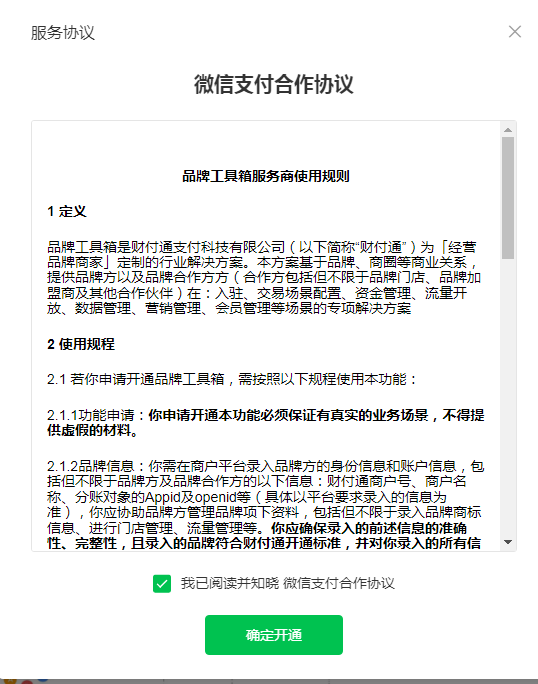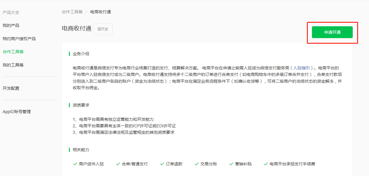 然后通过微信支付服务商后台申请开通工具包:电商收付通,提示无权限申请