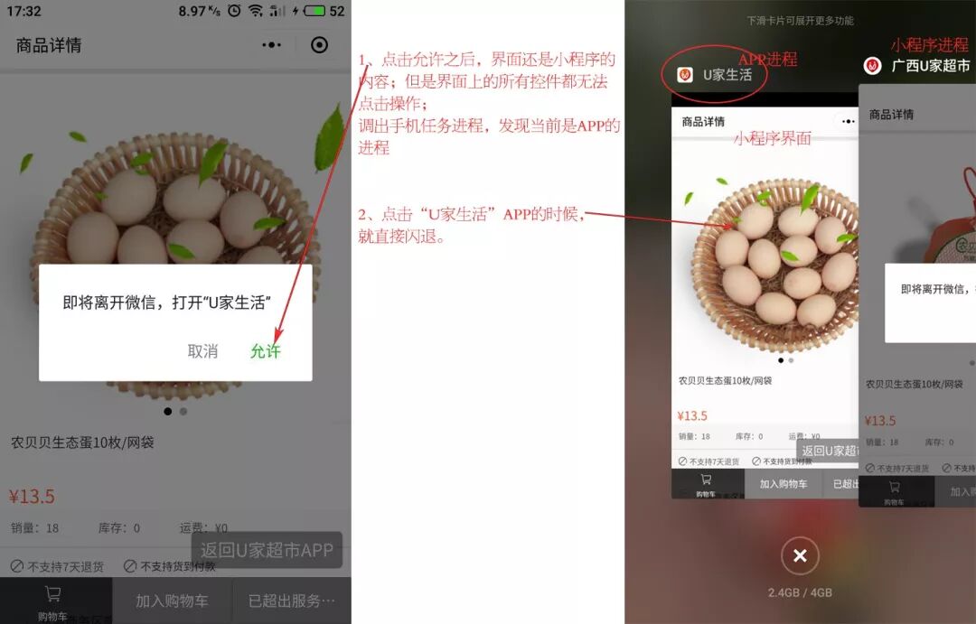 2、第二次开始,点击小程序button,回调执行了,但是WXEntryActivity卡在小程序页面中了,没有唤起App,back键后还是在微信