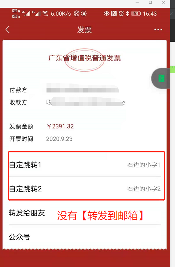 整个发票添加到微信卡包功能已经能调通了,但是发现和滴滴以及其他商家的不太一样,下面是我的卡包发票,没有【转发到邮箱】