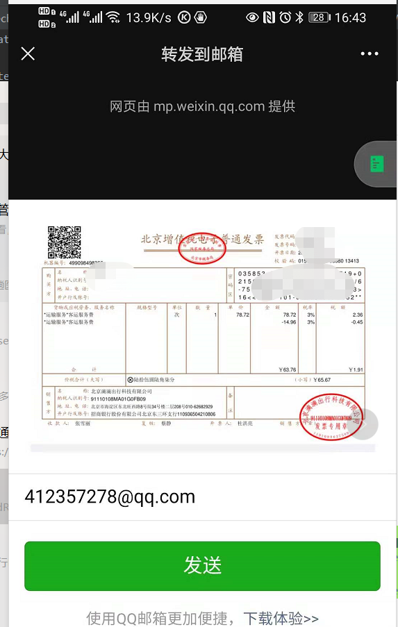 但是我看滴滴的发票卡包,是有转发到邮箱的,点击进去之后,是发票预览页面,页面的提供方是mp.weixin