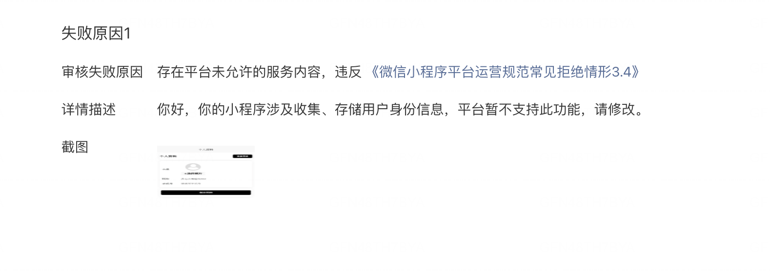 1.小程序涉及收集、存储用户身份信息,平台暂不支持此功能,请修改。