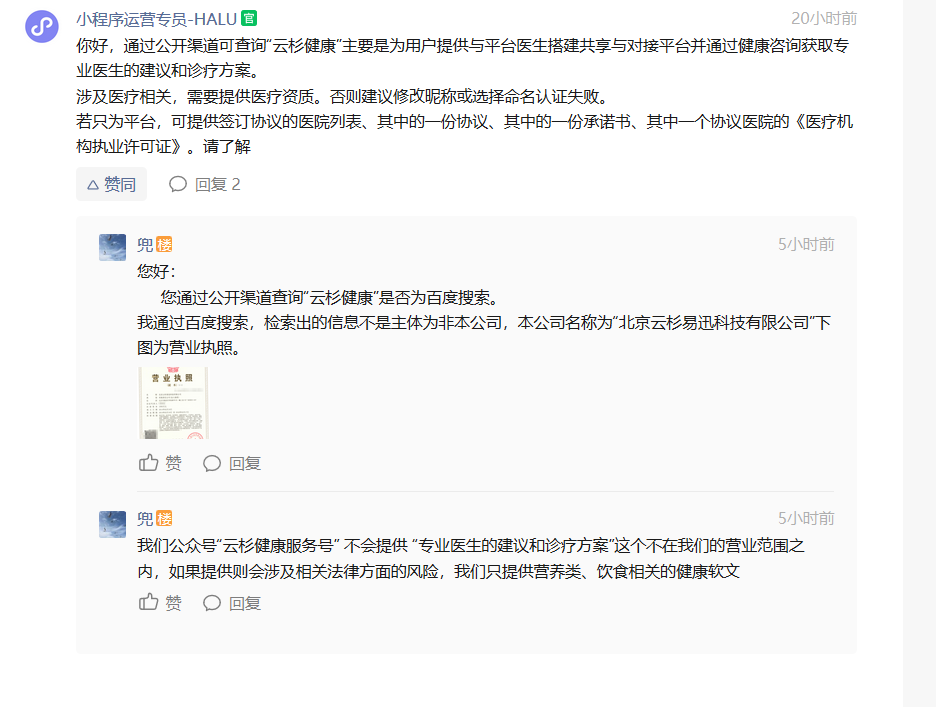 我是微信公众“云杉健康服务号”的管理人员,在2019年年审的过程中第三方审核机构 ‘上海倍通企业信用征信有限公司’。不予审核通过。返回结果如下图