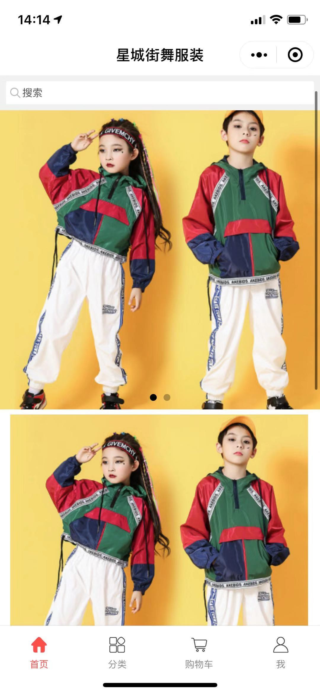 该用户为销售街舞服装的小程序,目前使用的是标准的商城模块销售服装