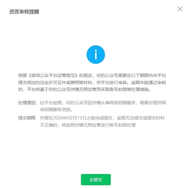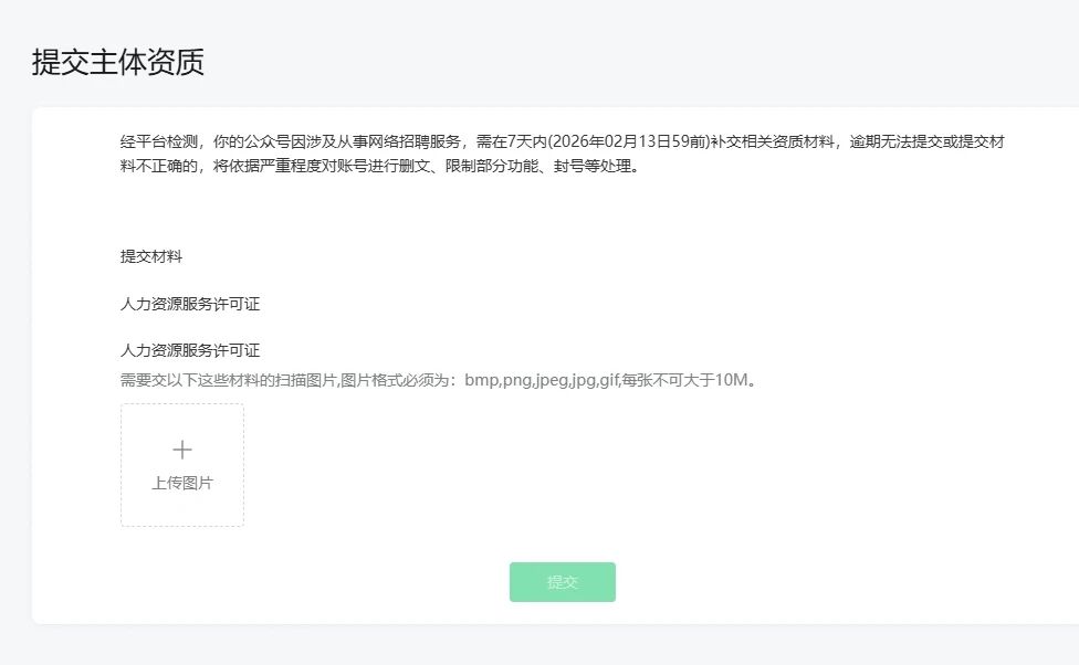 我公司运营的公众号被通知提供人力资源服务许可证,因为我们公司是做的出国劳务派遣,有出国劳务派遣证书,我们这个行业没有人力资源的证书,做国内的招聘才会办理这个证书,我们也制作国外的,我们有国外的正规资质,有证书,是不是我们提交对外劳务合作资格证书就可以了?因为咱们平台给下发了这个通知,我们想请尽快给予解决,请领导看到回复一下。