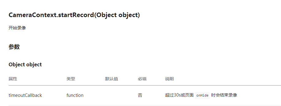 你好,以文档为准https://developers.weixin.qq.com/miniprogram/dev/api/media/camera/CameraContext.startRecord.html