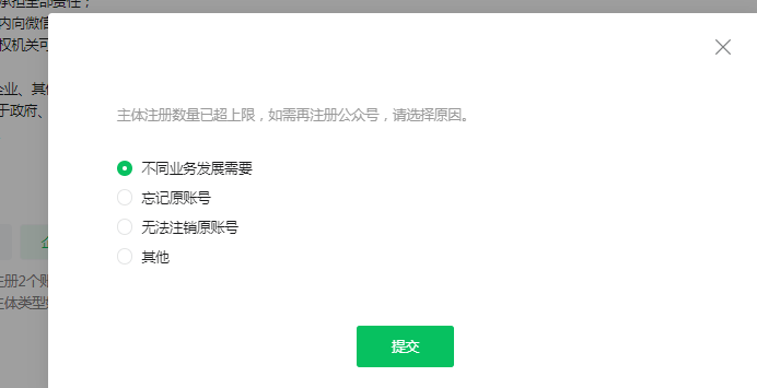 申请服务号的时候,最后说主体已绑定超过5个微信相关的公众号,这边在选项中点了不同业务发展需要,请问超过上限不能在申请了吗,选择这个可以继续申请成功服务号吗