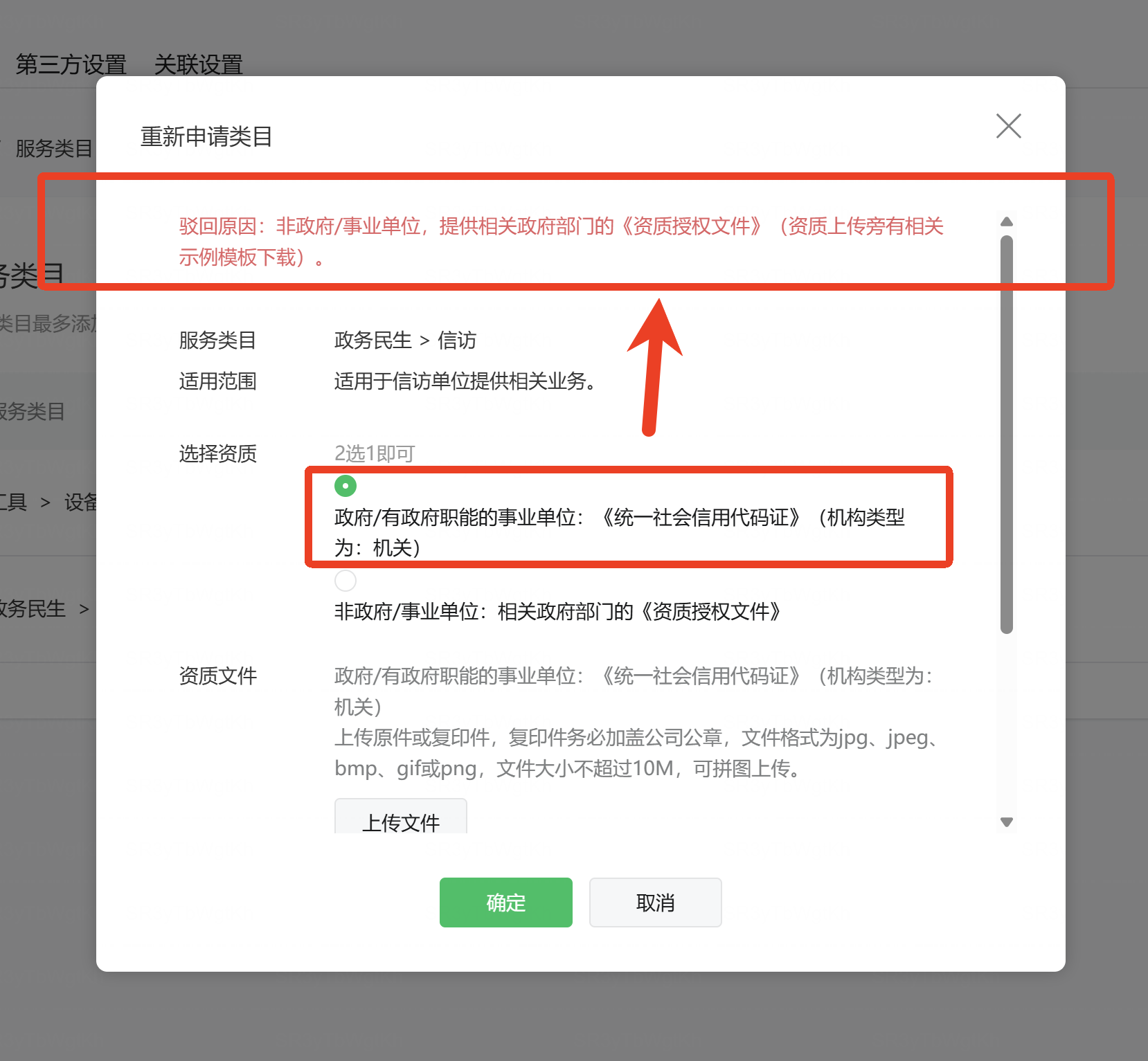 小程序申请“服务类目”,选择的是“政府/有政府职能的事业单位”,并且显示只需提供《统一社会信用代码证》。我上传了《统一社会信用代码证》,为什么申请不通过,提示需要《资质授权文件》?