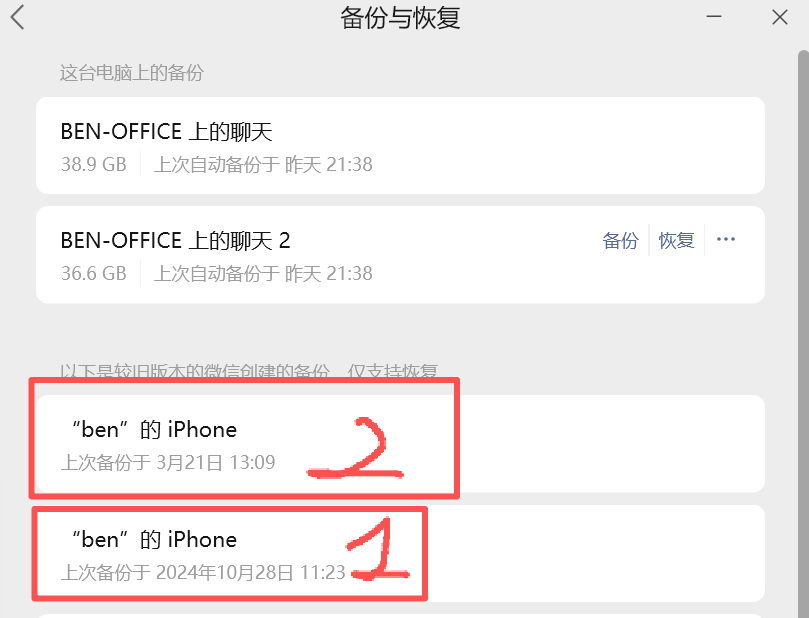 事情原由2025日03月21日,苹果手机(iPhone13),通过电脑备份了手机上所有的聊天记录(标记聊天记录20250321 ),电脑上同时保留了2024年10月28号被封的聊天记录(标记聊天记录20241028),接下来想通过电脑还原聊天记录2025031到其他手机也好还是回到原始A手机,都只获得20241028-20250321期间的聊天记录,尝试使用聊天记录20241028还原到手机,存在还原过程,还原结束后,微信软件占用手机内存量变大,但是无法识别还原的聊天记录20241028,静候一个晚上,记录还是无法读取。重启手机后,微信软件占用手机内存量又恢复到还原之前。20241028之前的聊天记录还是无法还原。