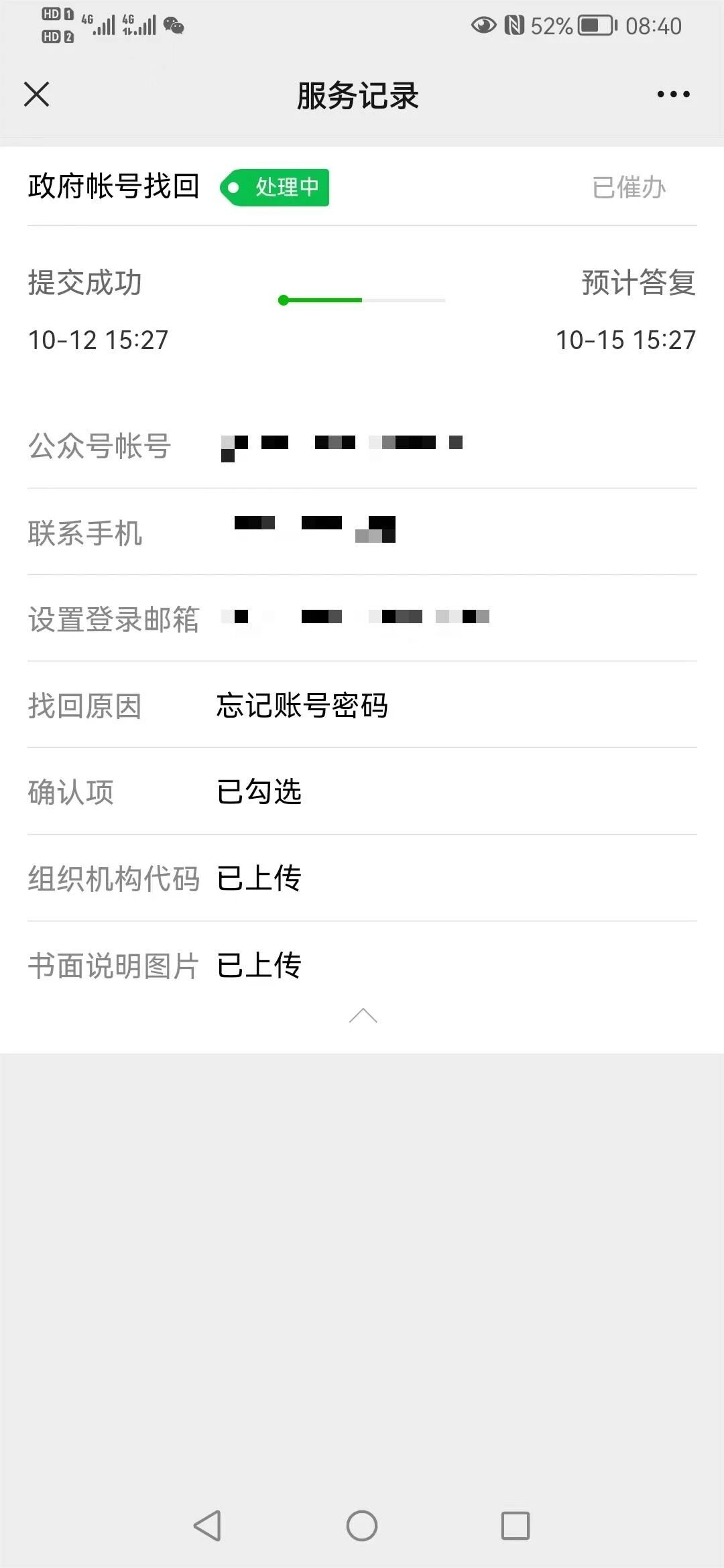 政府类型公众号,因对接人多次变动,账号密码已经遗失。10月12日申请找回,预计10月15日答复,今天10月20日,超期5天还未收到答复,请问应该怎么解决下?