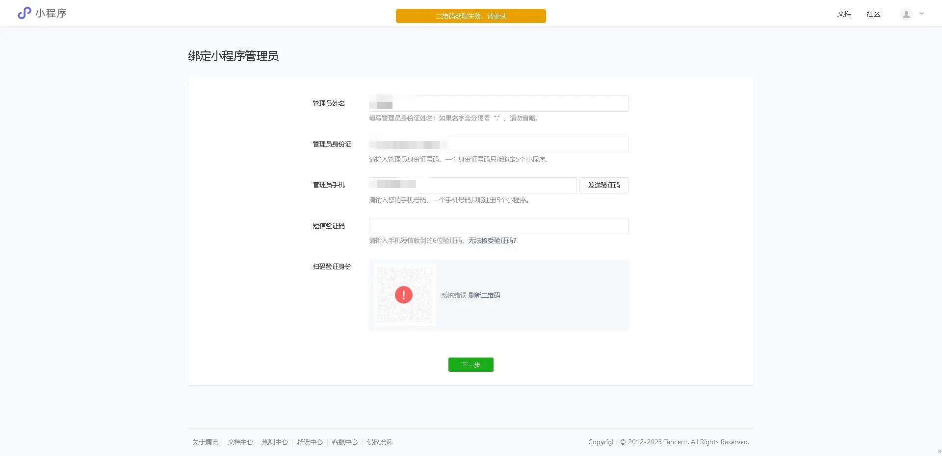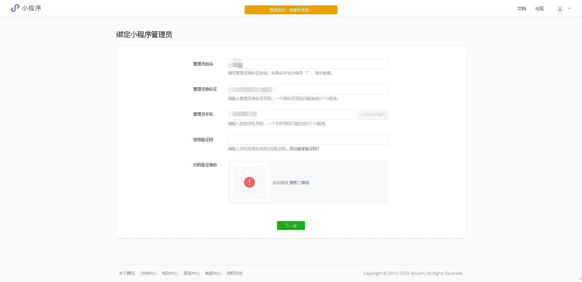 通过公众号注册的方式注册了一个新的小程序平台账号,在绑定管理员的时候,获取二维码失败,点击发送二维码,提示登录超时