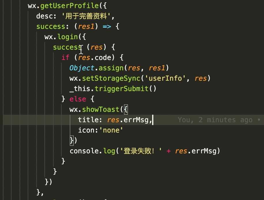 // 执行登录操作 let code = ''; wx.login({ success:(res) => { code = res.code; }, }); // 获取用户信息 wx.getUserProfile({ lang: 'zh_CN', desc: '用户登录', success: (res) => { let loginParams = { code: code, encryptedData: res.encryptedData, iv: res.iv, rawData: res.rawData, signature: res.signature }; _this.postLogin(loginParams); }, // 失败回调 fail: () => { // 弹出错误 App.showError('已拒绝小程序获取信息'); } });error msg: ''getUserProfile:fail can only be invoked by user TAP gesture"
