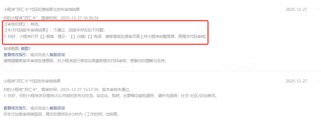 最搞笑的是,同样的拒审原因,25号我申诉了就给过了,27号第一次拒审申诉时也给过了,给了个别的理由「小程序打开报错」,说我们的页面404给拒了。我看了一下感觉申诉时的版本并不是提审时的那个版本,而是提审账号提交的最新版本(我切换成测试环境的版本),这是不是一个bug?