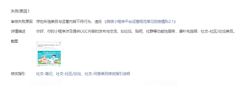 重新提交了一版,又被拒,理由还是「你好,你的小程序涉及提供UGC内容的发布与交流,如论坛、贴吧、社群等功能性服务,请补充选择:社交-社区/论坛类目。」