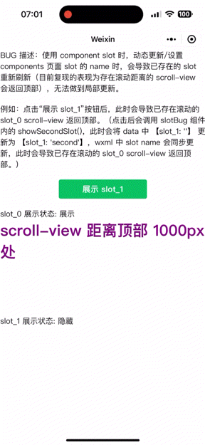 点击“展示 slot_1”按钮后,会调用 slotBug 组件内的 showSecondSlot(),此时会将 slotBug 中 data 的 【slot_1: ''】 设置为 【slot_1: 'second'】,wxml 中 <slot name="{{slot_1}}"></slot> 会同步由 '' 更新为 'second',此时会导致已存在滚动的 slot_0 scroll-view 返回顶部。