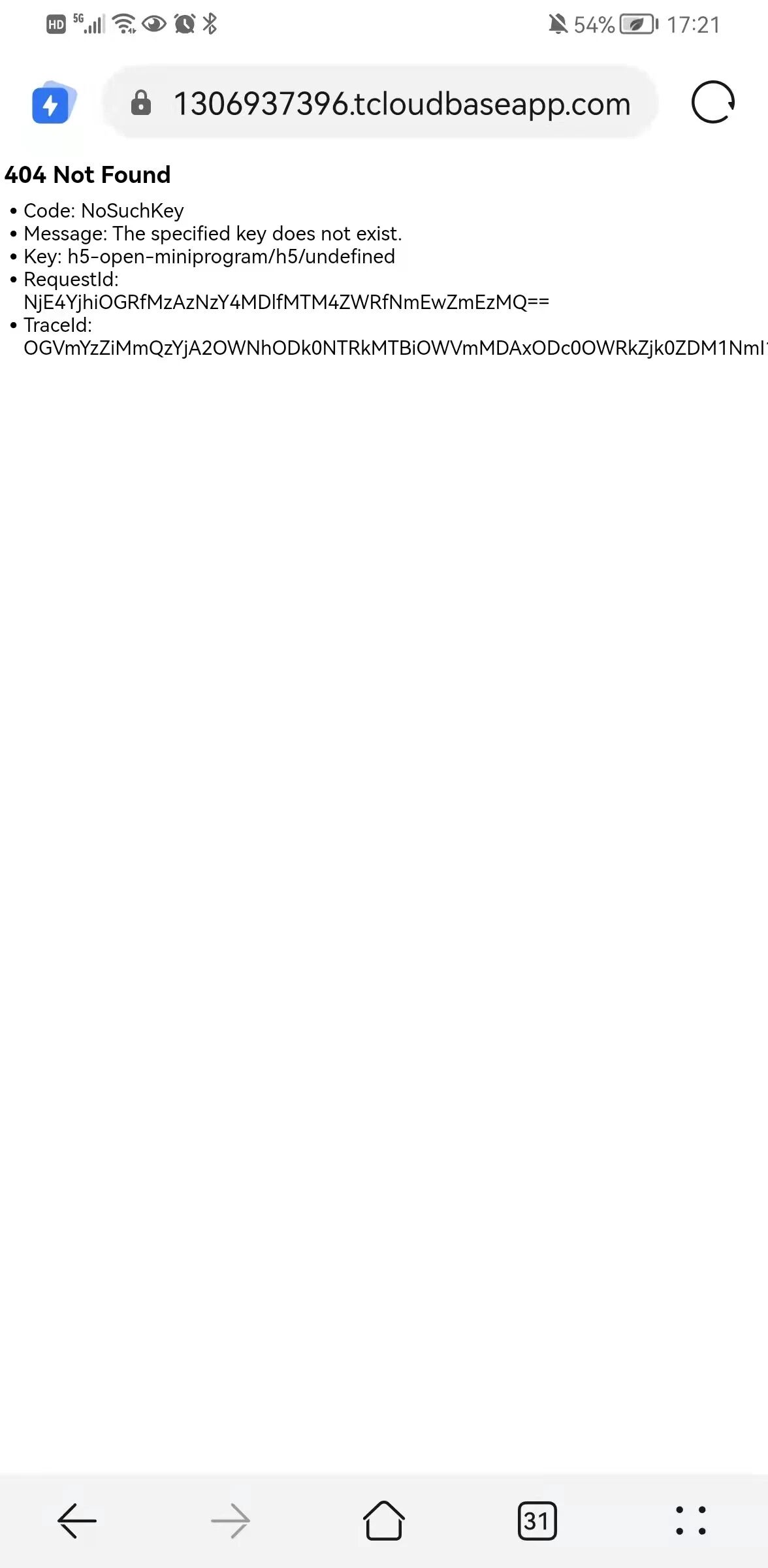 根据官方提供h5跳转小程序的方法(https://developers.weixin.qq.com/miniprogram/dev/wxcloud/guide/staticstorage/jump-miniprogram.html),部署到静态网站上面,在微信浏览器打开地址确实能打开微信小程序(如第2张图),但是在非浏览器里面就返回404页面(如地1张图),请问这是怎么回事?