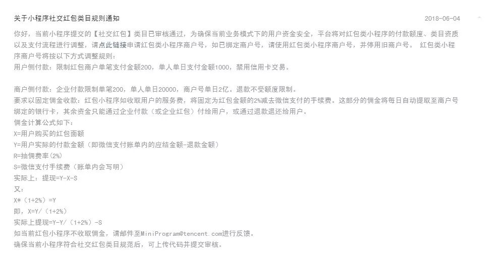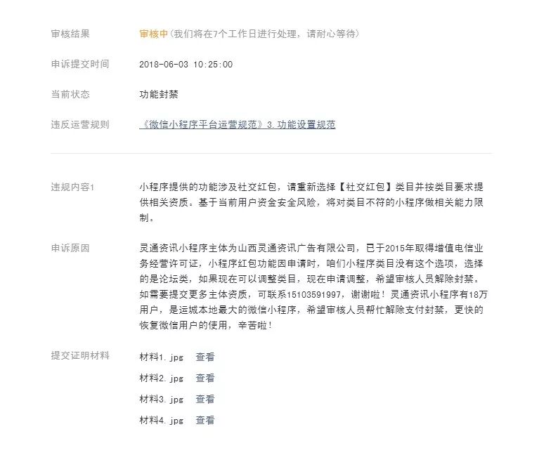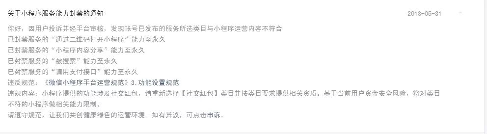 官方大大,你们好,很不好意思来打扰你们,我们做了个小程序,正常运营半年之后,因申请时,咱们小程序类目没有社交红包这个选项,选择的是论坛类,社交红包类目还没有上线。5月份导致部分功能被封禁了,后来出了通知,我们按照官方指引进行整改,已添加调整类目社交红包类目,社交红包类目已经审核通过,红包类小程序商户号也已申请完成,我们是小团队,申请一个小程序很不容易,等待的时间也很长,麻烦各位官方大神给予解封处理,辛苦啦!因搜索功能被禁,红包类小程序商户号后台支付授权搜索不到APPID,小程序支付功能无法正常切换至红包类小程序商户号。
