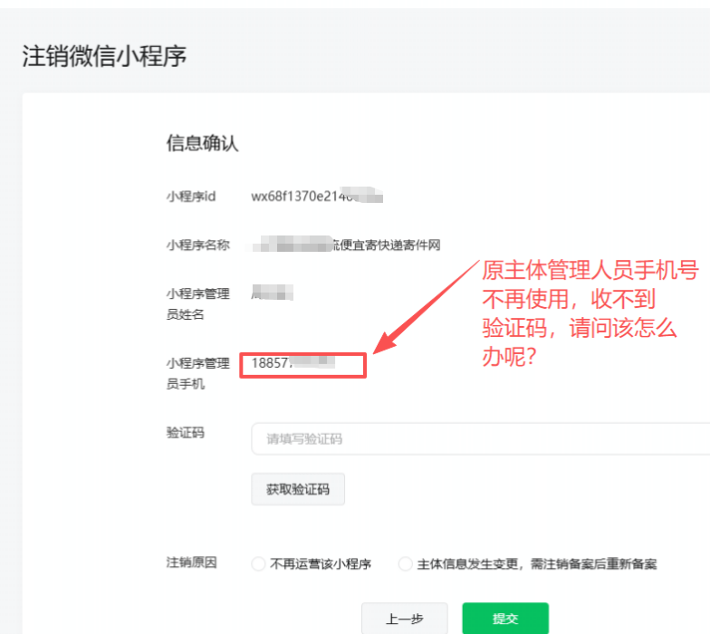 小程序主体迁移成功后,原主体的备案需要注销,迁移过来新主体时发现要重新备案,联系原主体当初小程序管理人员回复说手机号已经不再使用了,收不到验证码,请问该怎么注销?,迁移过来的新主体备案时发现一定要把老主体的备案先注销掉,新主体才可以重新备案