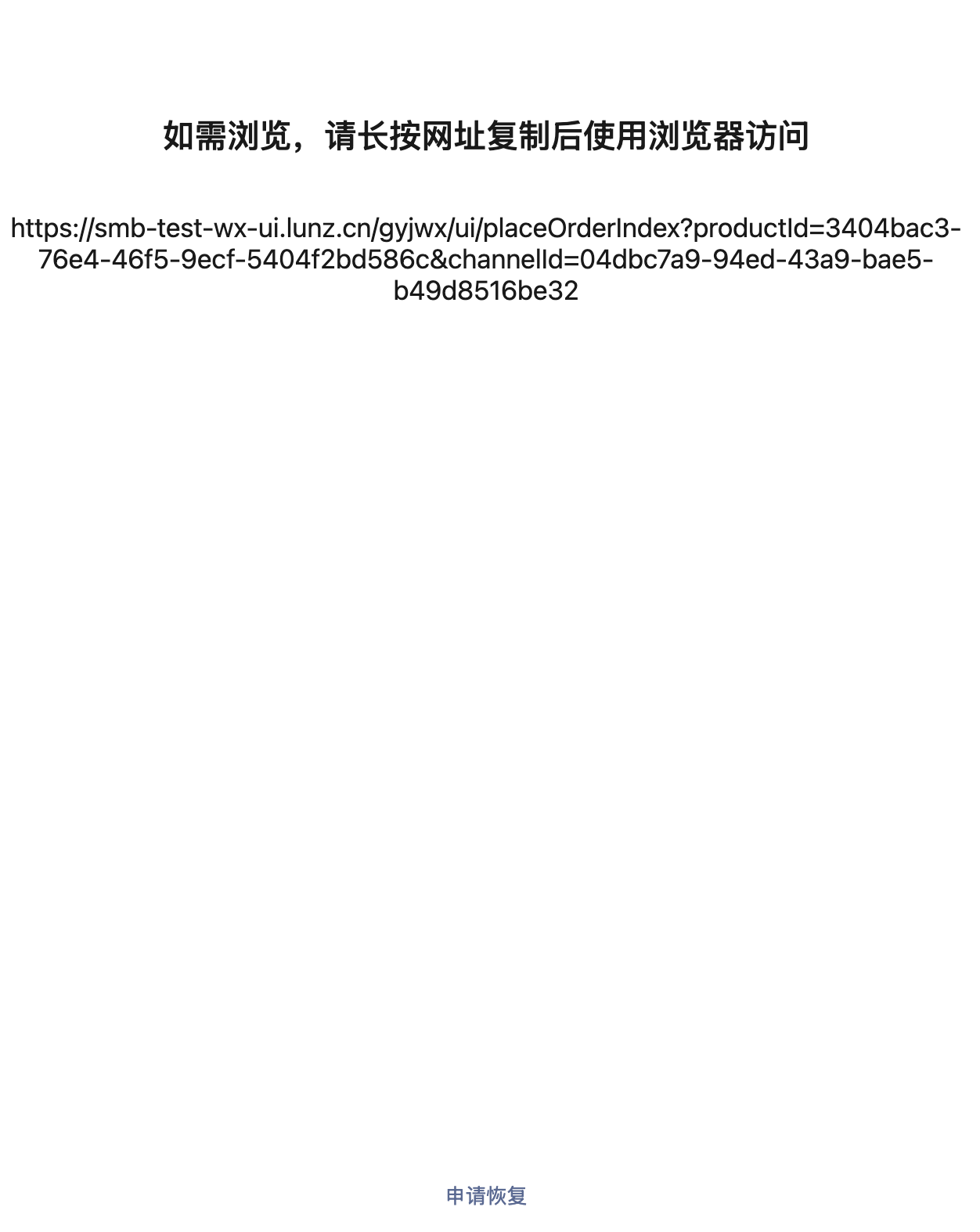 网址:https://smb-test-wx-ui.lunz.cn/gyjwx/ui/placeOrderIndex?productId=3404bac3-76e4-46f5-9ecf-5404f2bd586c&channelId=04dbc7a9-94ed-43a9-bae5-b49d8516be32