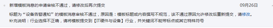 现在由于业务需要,申请了两个英文的模板,但是审核结果是不通过;具体原因提示为:“行业选择不正确,请将模板提交到【IT硬件与设备】行业。”, 请问这种情况下,我把所属行业修改修改为:
