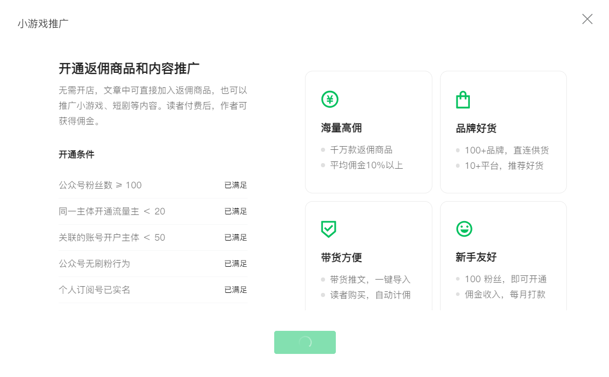 开通小游戏推广一直在加载界面无法通过,退出登录、更换浏览器仍然一直在加载中