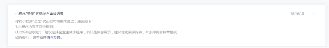 你好,经核实,你方小程序涉及商家自营模式(如含购物车、立即购买按钮、结算按钮等),属个人小程序未开放类目,建议选择企业主体小程序,或自查代码,确保含商家自营模式内容的前端展示、小程序代码等整体均移除,然后重新定位小程序功能再提交审核。