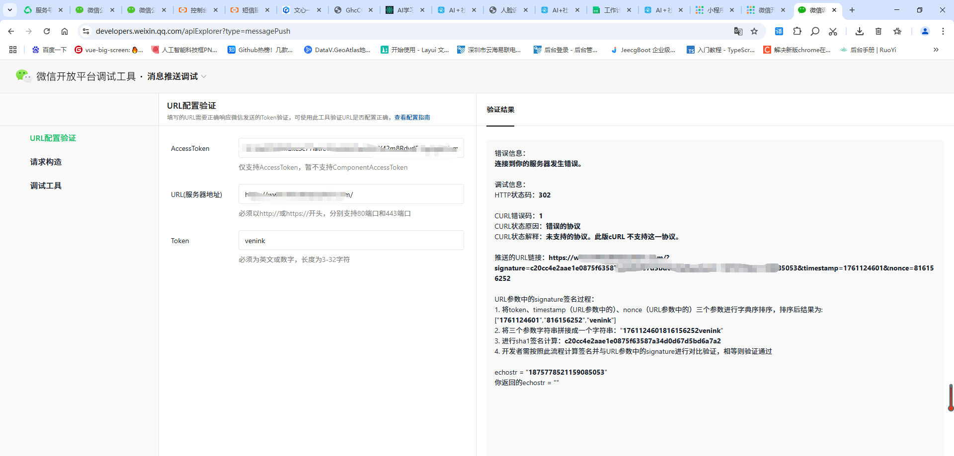你好,开发者调试可以用官方工具试试: https://developers.weixin.qq.com/apiExplorer?type=messagePush