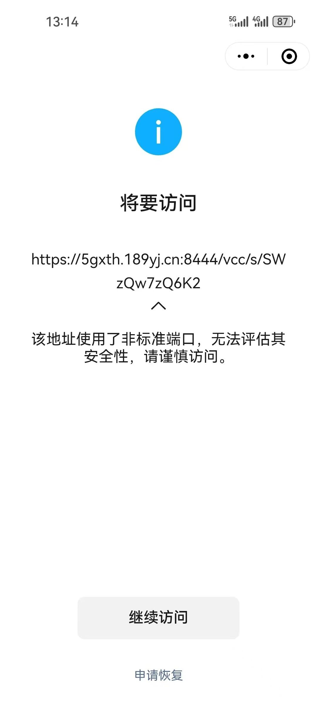 网站域名:189yj.cn,端口8444。该网站用于为比亚迪财险等保险客户提供视频查勘、理赔等服务。近期发现客户经小程序短链接打开网站时会提示 "该地址使用了非标准端口,无法评估其安全性,请谨慎访问。"