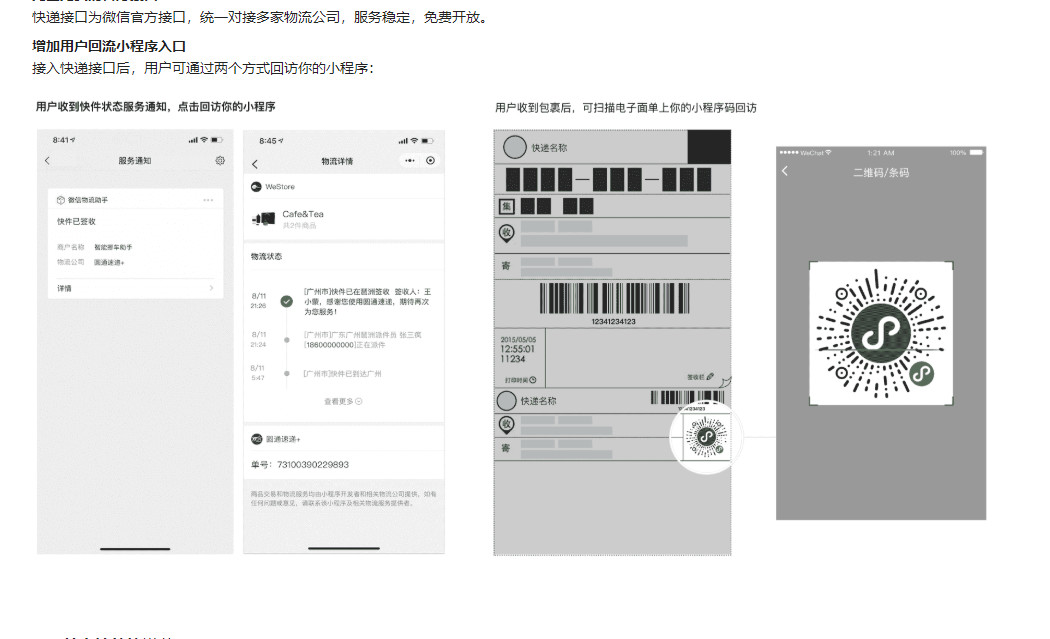 目前顺丰,圆通,百世,德邦,申通支持电子面单展示小程序码,不需要商户特殊配置