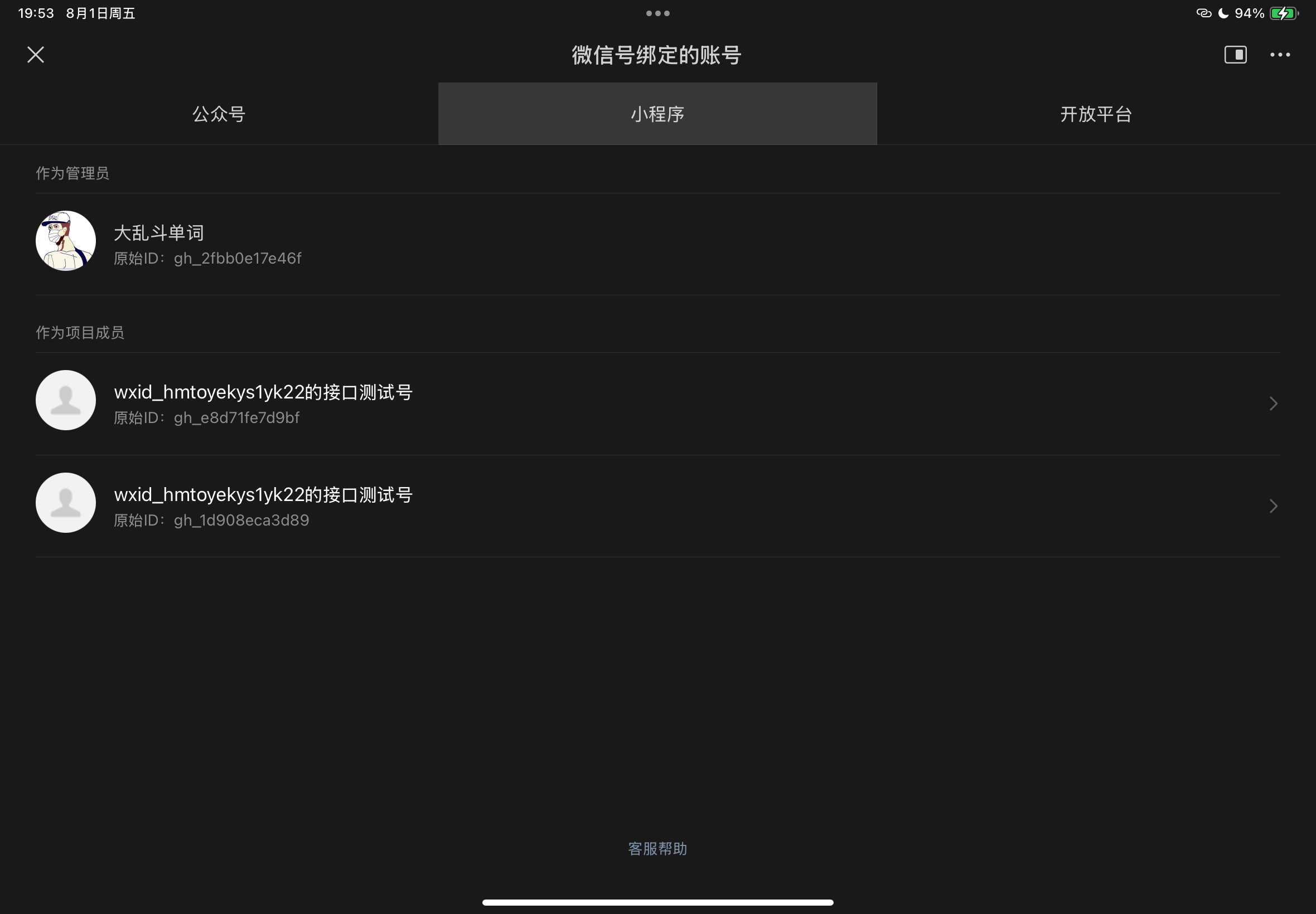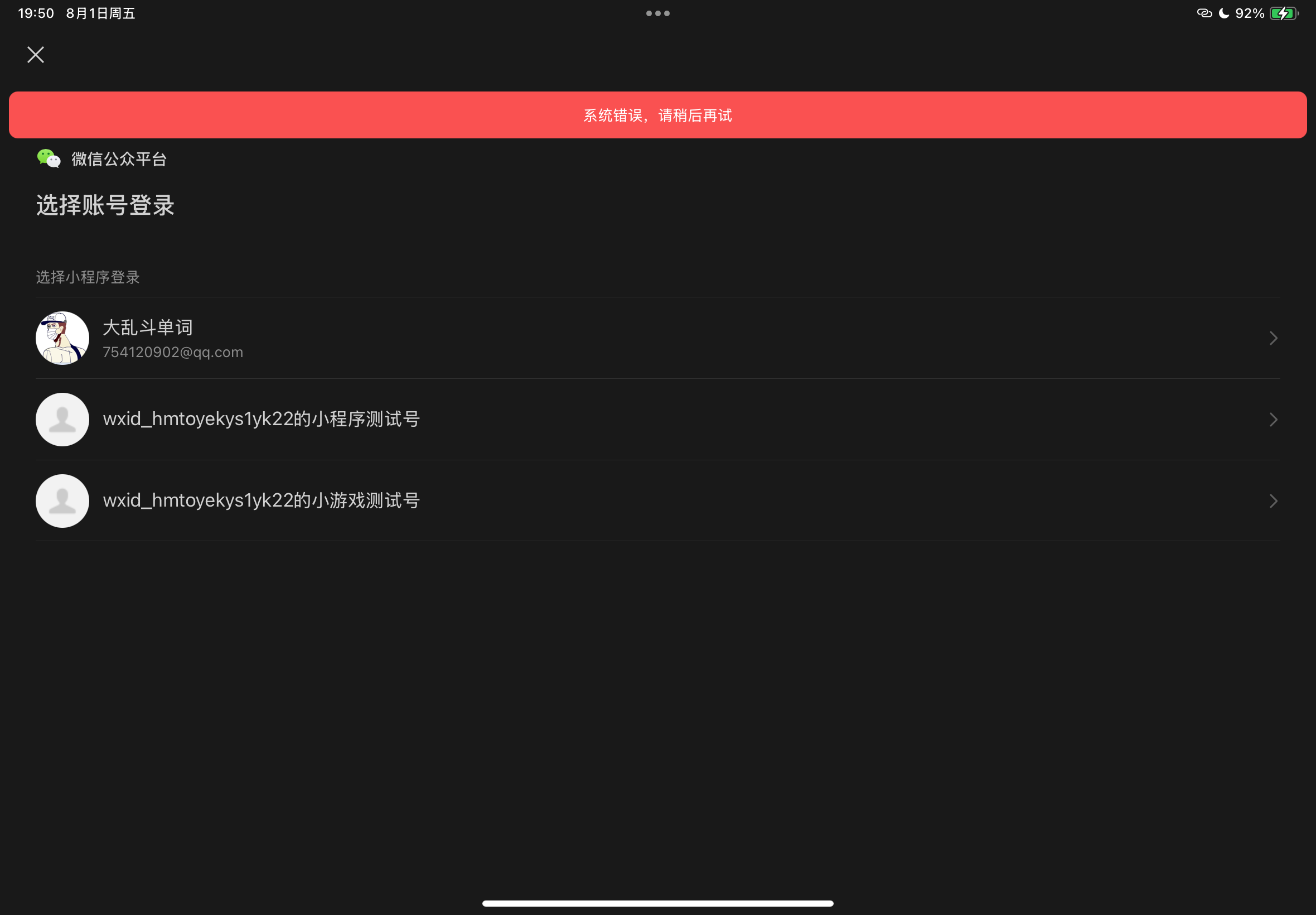 我遇到了与社区提问https://developers.weixin.qq.com/community/develop/doc/00060ce290c7b806b0a2d228666800?highLine=%25E6%25B5%258B%25E8%25AF%2595%25E5%258F%25B7%25E6%2597%25A0%25E6%25B3%2595%25E7%2599%25BB%25E5%25BD%2595 中相同的问题,无法 在微信开发者平台 登录 测试号,我试过换网络,换手机平板, 重新解绑申请 测试号,都无法登录 微信开发者平台,也无法获取 appid 与 secret 下面的小程序测试号 的appid为wxebae7a6ce5abb751,原始id为gh_e8d71fe7d9bf.