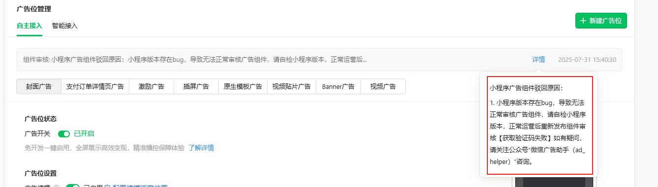 小程序广告审核一直驳回,理由是小程序版本存在bug,导致无法审核广告,但是本地开发测试所有都正常,也没有报错,所有想到的可能性都想了,还是这样,请大神帮忙看看有可能是什么问题