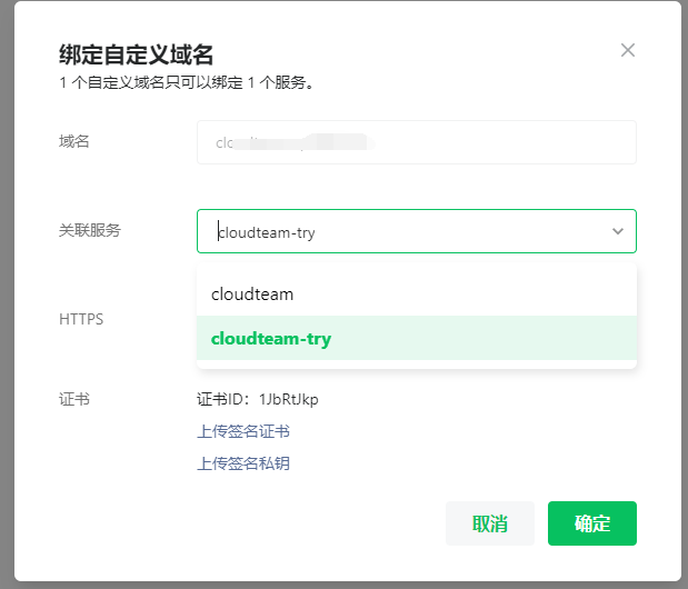 最开始绑定在cloudteam服务上,然后切换关联另一个cloudteam-try服务,域名访问就404了