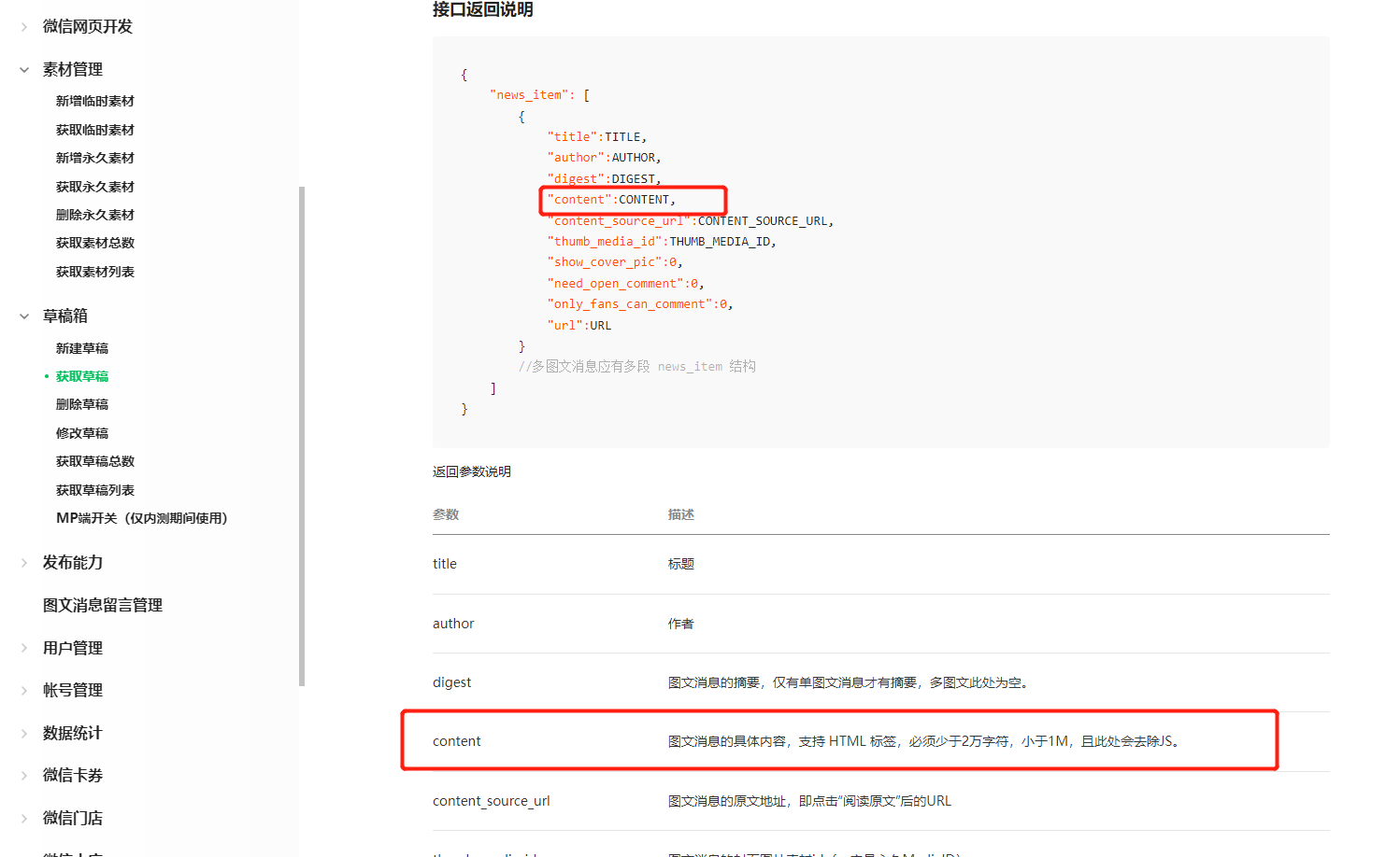 具体使用场景:在我们自己后台系统,通过新建草稿接口,上传图片,新建草稿箱成功后,公众号后台是显示正常的,然后在我们后台点击编辑,这时候我们调用获取草稿接口,发现获取不了图片地址,只有文字信息;