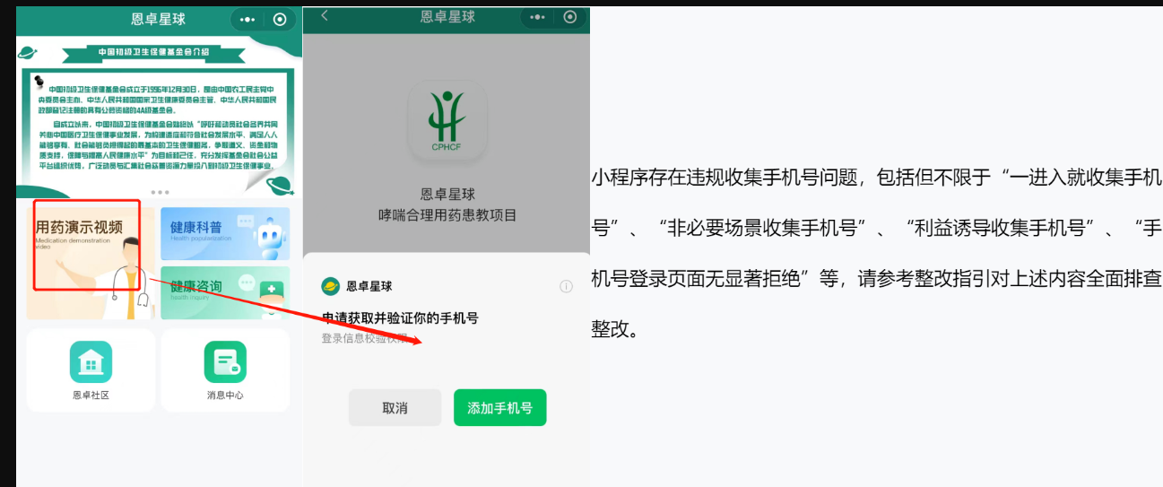违规原因始终发这一张图,查看图片示意,对“非必要场景手机手机号”的要求进行整改。目前小程序在用户未登录时,用户可查看首页所有模块,并且可进入查看详情内容。提升通过后进行申诉依然无法通过,并且现在再进行申诉流程,已没有申诉入口。两次申诉均未给具体原因,请相关工作人员核实,若小程序违规,请给出具体原因!!!让开发者与用户能够清晰的了解具体调整方式,而避免陷入流程的内耗里。