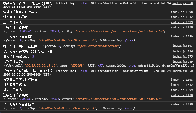 连接设备失败connect- {"errno": 1509001, "errCode": 10003, "errMsg": "createBLEConnection:fail:connection fail status:133"}