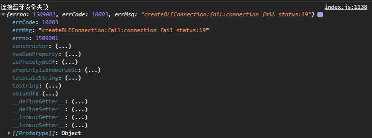 连接设备失败connect- {"errno": 1509001, "errCode": 10003, "errMsg": "createBLEConnection:fail:connection fail status:8"}