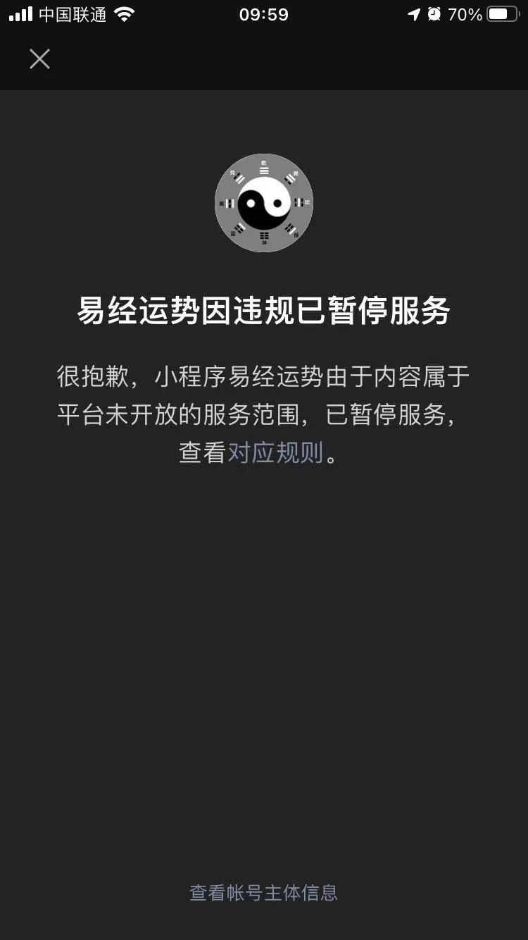 我找了找类似的程序,六爻运程(appID:wxb613a42b1a4ef201),六爻占卜(appID:wx13f0c4ec5e514269) 等类似程序,并发贴子问“为什么他们能不下线?”