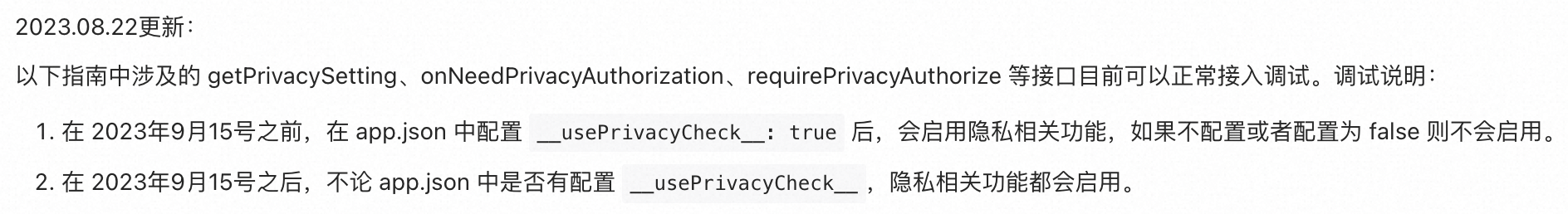 配置了 __usePrivacyCheck__: true 和 wx.onNeedPrivacyAuthorization,上架后 新版本灰度用户不会触发隐私拦截,隐私API都能正常调通,只有删包后重新打开才会触发拦截生效。这个结果跟官方描述不一致,这种不触发拦截的用户在915之后会是什么表现?体验版都是会正常触发拦截,你们是不是还有什么线上的开关在做控制。我们就想在915前,批量灰度覆盖到用户,避免915一次性生效。