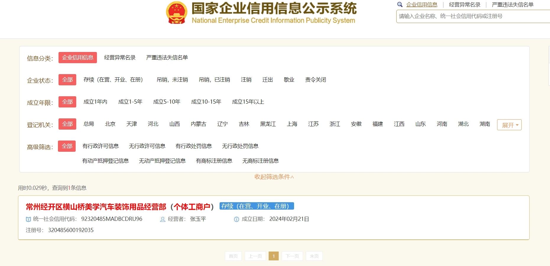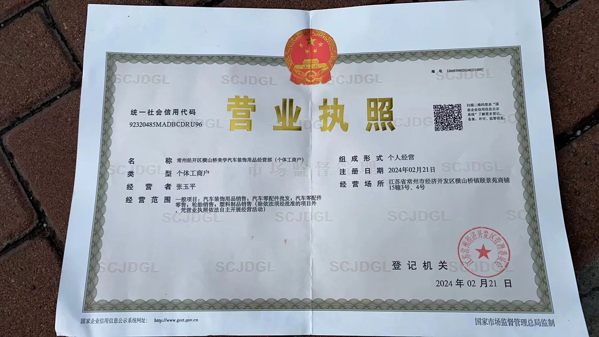 名称:常州经开区横山桥美学汽车装饰用品经营部(个体工商户)